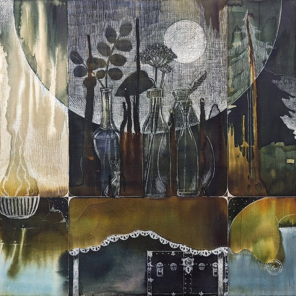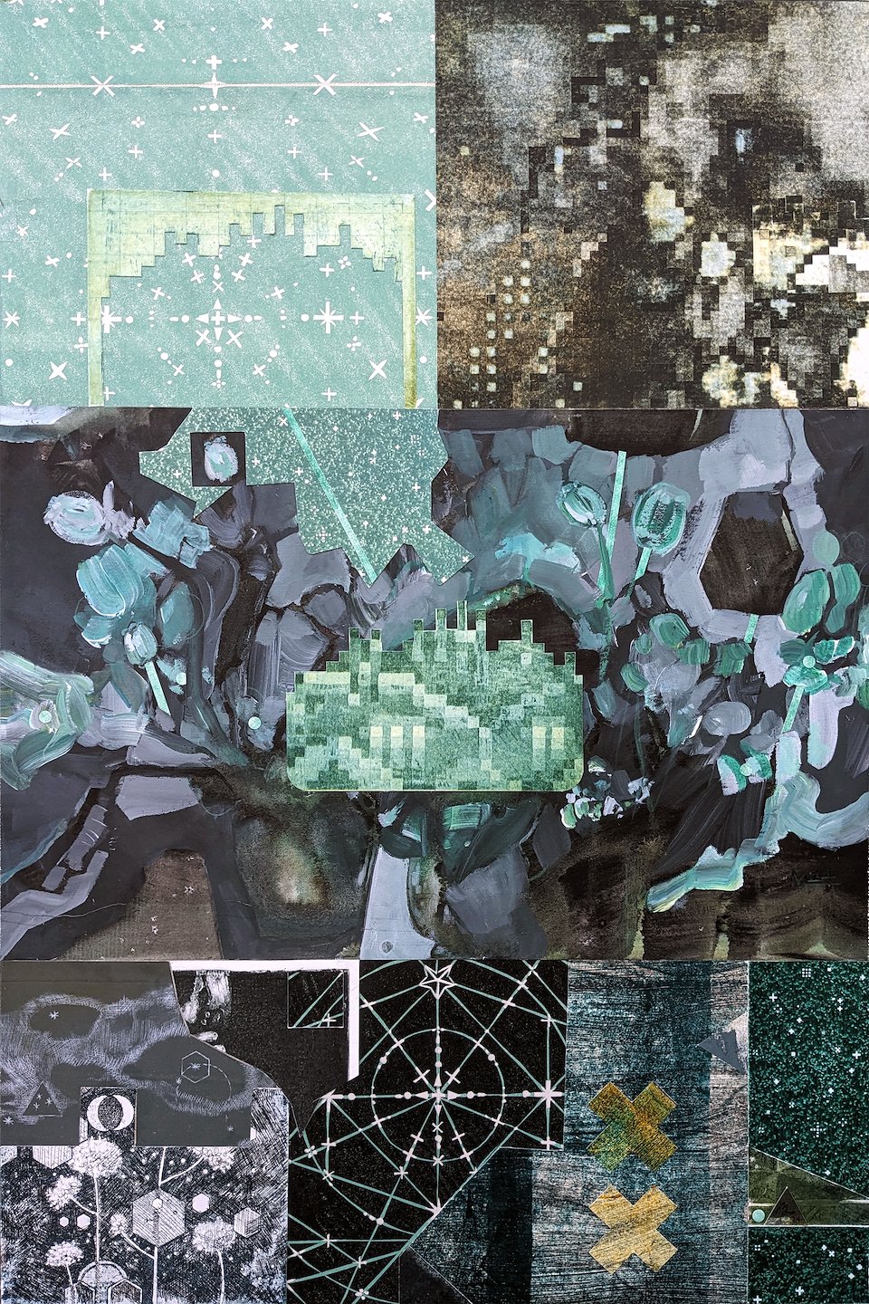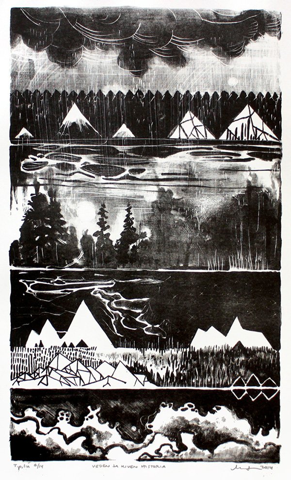 This "making a meal out of leftovers" in pictorial format is a smörgåsbord of different printmaking techniques: etching, aquatint, drypoint, carborundum, linocut and imagon are all represented.