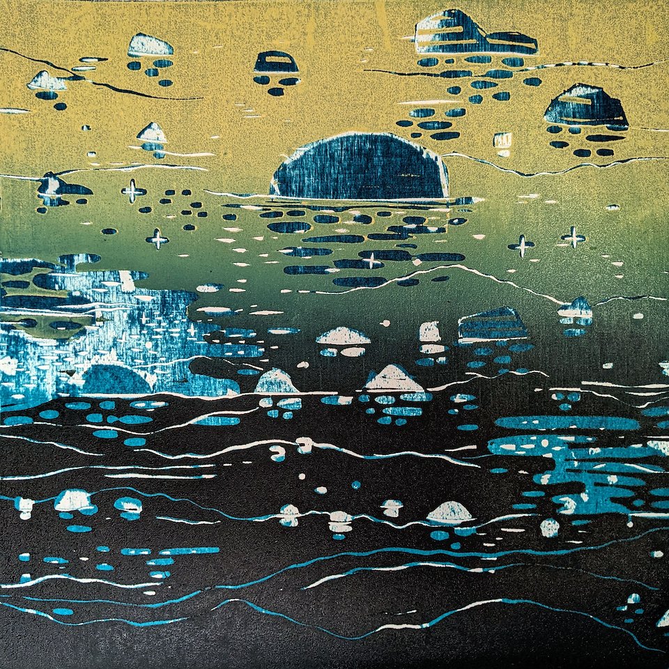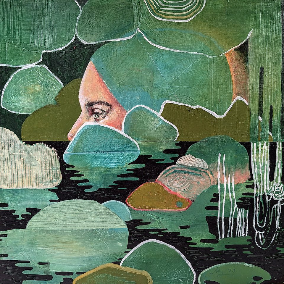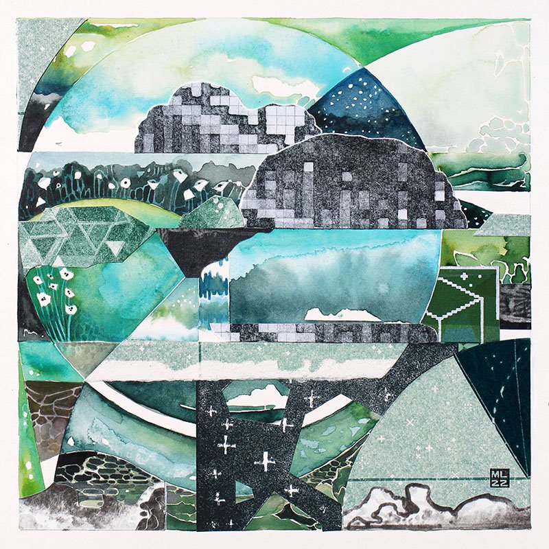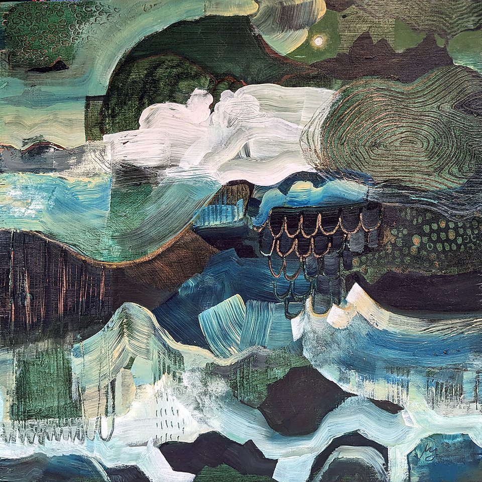 Mixed media (acrylics, ink, coloured pencils and printmaking collage) on plywood