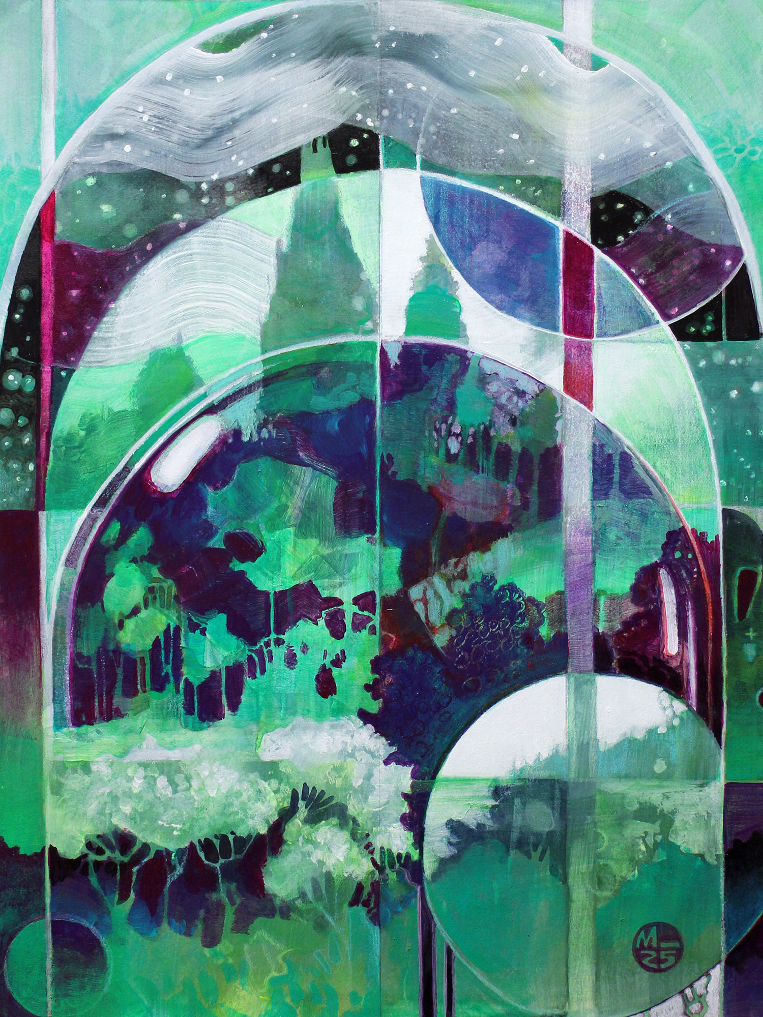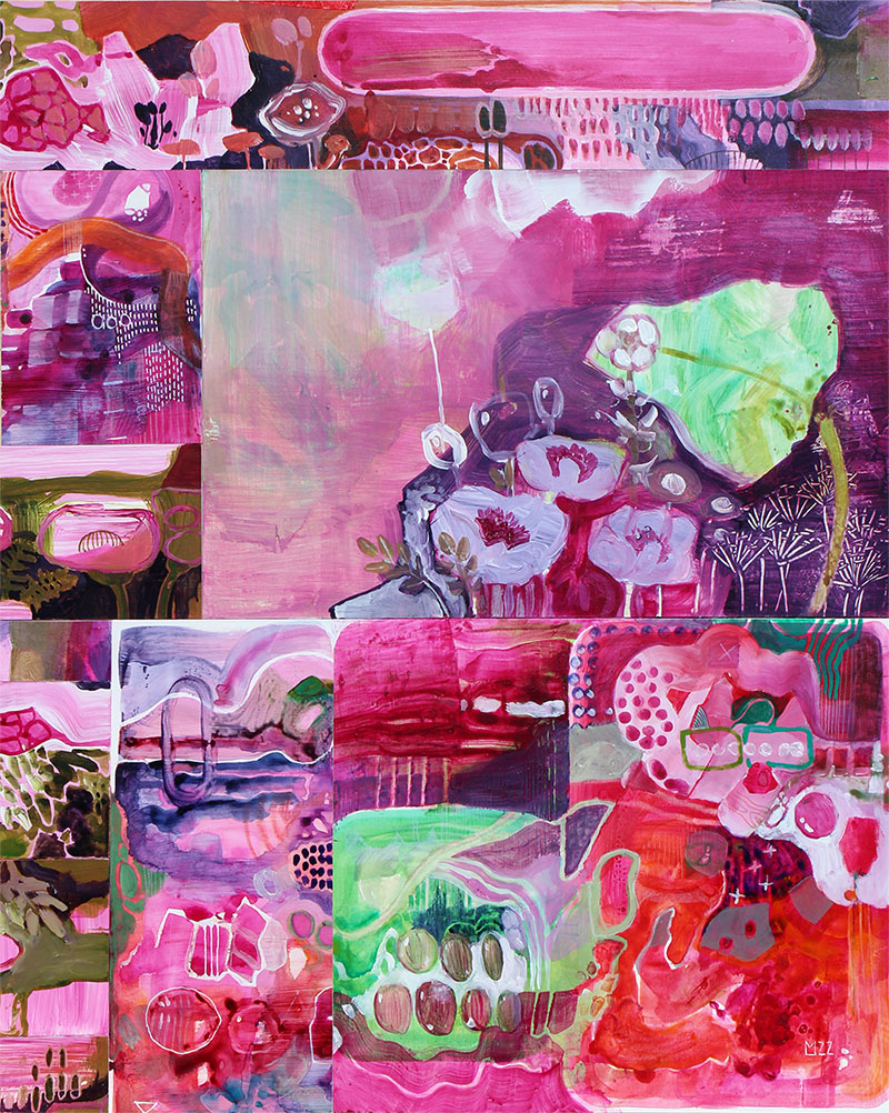 Acrylics, acrylic marker & ink collage on 4G cardboard